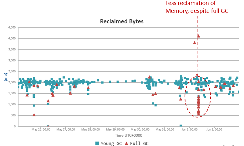 Reclaimed Bytes Graph showing poor reclamation of memory despite full GC